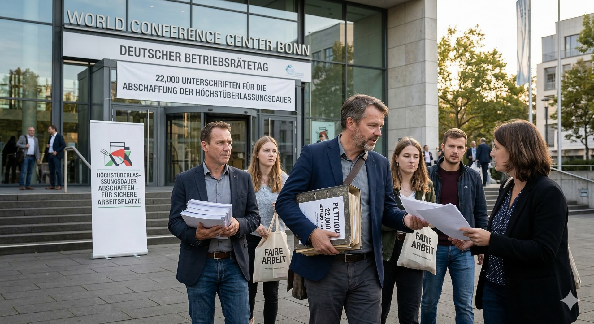 Angeführt von unserem Listenführer Swen Tech haben wir uns 2018 dazu entschlossen der Politik ein deutliches Zeichen mit einer Petition zur Abschaffung der Höchstüberlassungsdauer zu setzen. Diese hatte erst kurz zuvor die maximale Höchstüberlassungsdauer für Zeitarbeitnehmer beschlossen. Die Folgen waren finanzielle Nachteile oder berufliche Ängste für die Beschäftigten. Der erhoffte Übernahmeeffekt blieb aus. Wir sprachen mit Kollegen, Politikern oder auf dem deutschen Betriebsrätetag in Bonn und sammelten